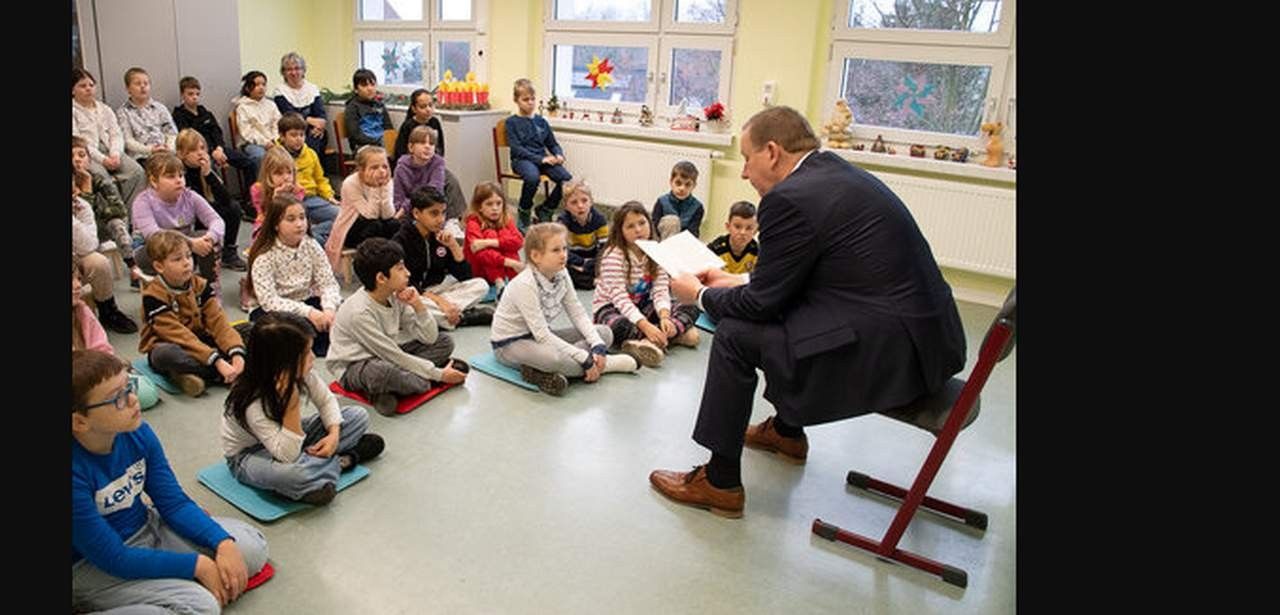 Landrat Christian Jaschinski las Grundschulkindern der dritten und vierten Klasse aus dem neuen Kinderbuch der Autorin Marie Hüttner vor, in dem Freundschaft, Mut, Anderssein und Verantwortung zentrale Themen sind. Seine Worte waren verständlich und anregend gestaltet, damit die Jungen und Mädchen sich wohlfühlten und zum Mitmachen ermutigt wurden. Fragen beantworten und eigene Geschichten erfinden gehörten ebenso dazu. Jaschinski erläuterte, dass Bücher Türen zu neuen Ideen, spannenden Erfahrungen und unterschiedlichen Blickwinkeln öffnen und so die Begeisterung für das Lesen fördern.